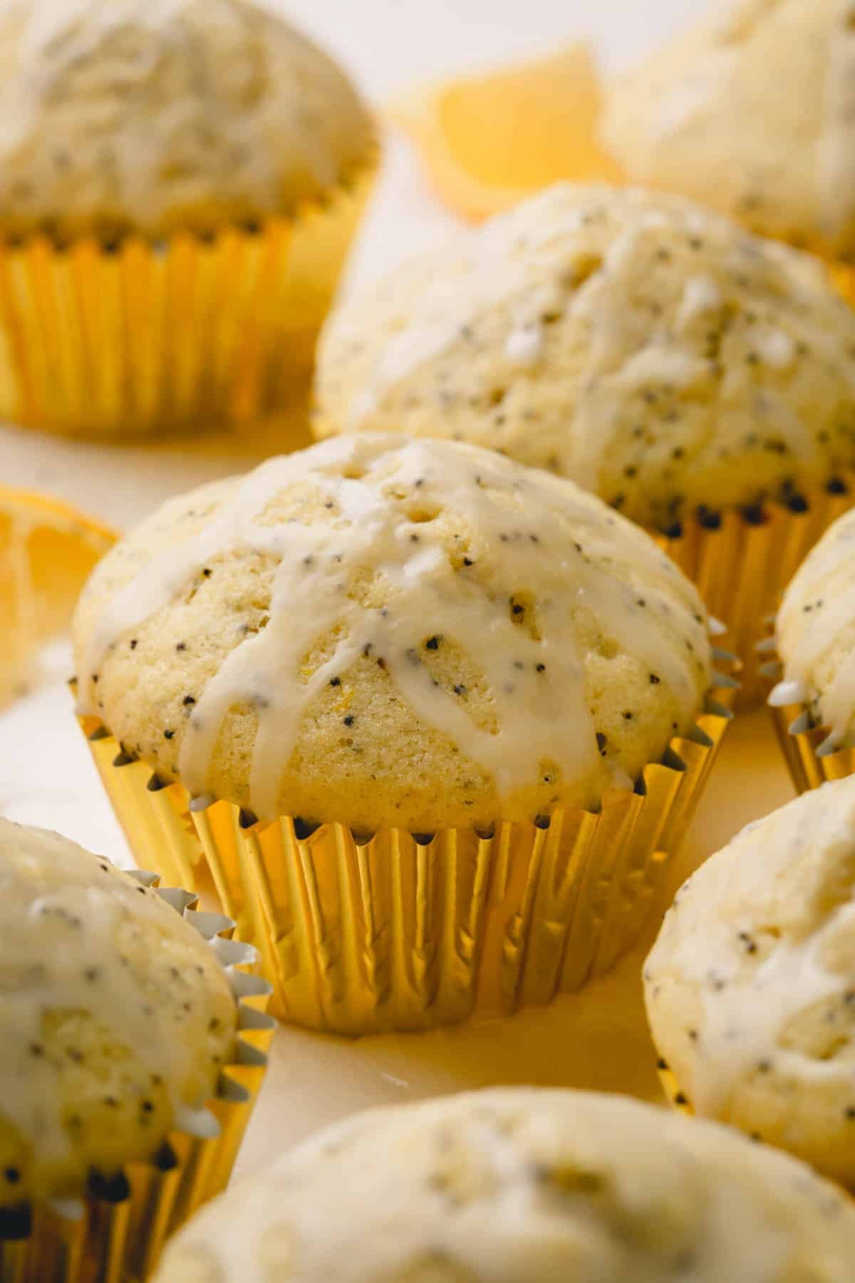 These lemon poppy seed muffins have a bright, citrusy flavor and a sugary, sweet lemon glaze. Serve them for a delightful breakfast, brunch, or afternoon treat.
