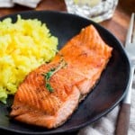 Beautiful pan fried steelhead trout with crispy skin and juicy tender meat, smothered with tangy thyme lemon butter sauce. Delicious dinner in minutes!